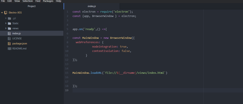 In the index.js file, you'll see webPreferences, which are settings of features that can be enabled in web pages. Let's see what features are enabled.